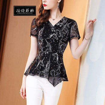 拉伦菲韵 意式高端品牌女装 短袖碎花雪纺衫2020夏装法式复古洋气百搭修身显瘦收腰V领上衣潮 黑色 L