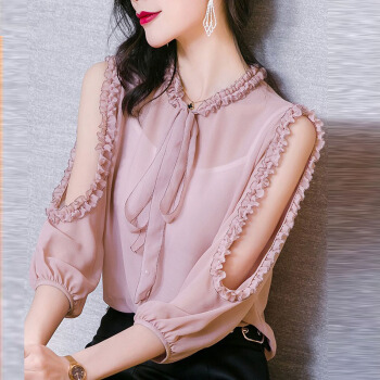 雪纺衬衫女装2020夏季新款韩版时尚系带洋气木耳边宽松百搭上衣设计感小众衬衣女 粉红色 L