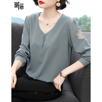 【精选好货】晞薇雪纺上衣2020新款春夏装时尚简约打底衫中年妈妈大码长袖T恤女洋气小衫遮肚宽松 浅灰蓝 请拍正确尺码