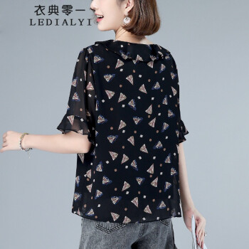 衣典零一 2020夏装新款夏季女装雪纺衫女时尚百搭韩版休闲宽松女士妈妈装印花短袖T恤衫女上衣衫衣小衫 黑色 XL