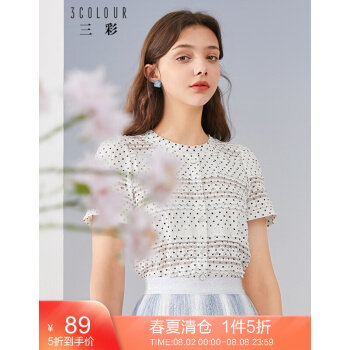 三彩2020夏季新款圆领短款直筒波点蕾丝印花单排扣短袖衬衫女 白色 155/80A/S