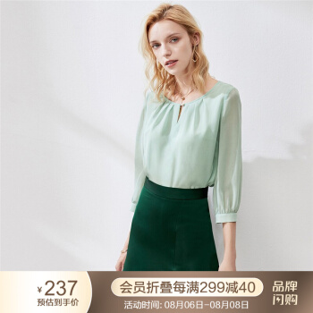 颜域薄荷绿圆领雪纺衫女2020新款秋装减龄宽松显瘦七分袖气质上衣 浅绿 M