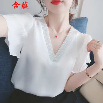 含蕴 超仙雪纺衫女2020夏季新款白色短袖宽松v领上衣洋气衬衫气质小衫衬衣女 白色 S