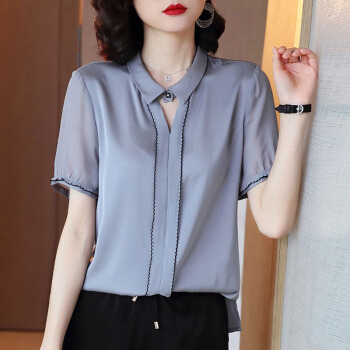 依语幽香休闲衬衫女装2020夏季新款短袖通勤衬衣百搭上衣缎面纯色 浅灰色 L
