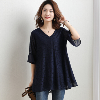 红粉宣言2020夏季新款百搭宽松收腰短袖雪纺上女圆领显瘦上衣 藏青色 2XL
