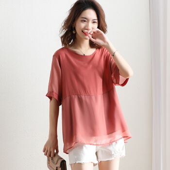 红粉宣言2020夏季新款宽松套头拼接雪纺衫女短袖大码女装 粉色 L