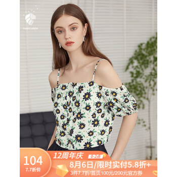 范思蓝恩 2020夏新款碎花雪纺衫短款一字肩上衣女短袖露肩吊带小衫 白底印花 XS