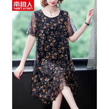 南极人 中年连衣裙2020夏季新款大码中老年女装妈妈装贵夫人高端气质遮肚中长款雪纺碎花裙子 N3-BH358-16025-黑色 3XL