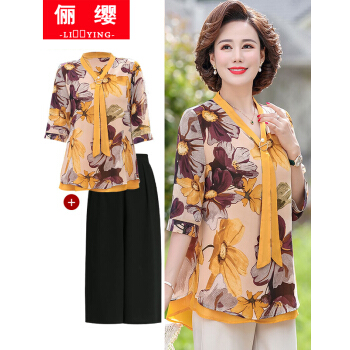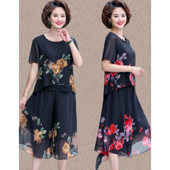 俪缨中老年女装夏装休闲套装女短袖上衣2020新款洋气4050岁中年妇女雪纺衫两件套阔太太妈妈装小衫 1号色+阔腿裤 2XL(建议105-120斤穿)