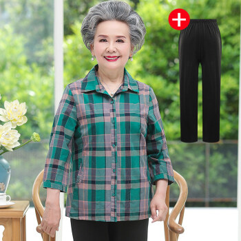 孝珍老年人女装夏装纯棉九分袖衬衫奶奶装格子衬衣套装中老年妈妈装两件套 绿格子+裤子 2XL码(建议体重105-120斤)