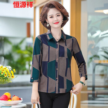 恒源祥中老年妈妈女装春秋新品衬衣女士薄款长袖七分袖衬衫时尚百搭宽松大码开衫老年人奶奶上衣 2101绿色 2XL建议100--115斤