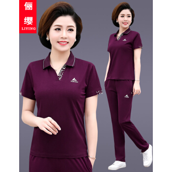 俪缨中老年女装2020夏装新款4050岁中年运动套装T恤上衣裤子女装休闲宽松大码妈妈装两件套女装 紫红色 L(105-115斤)