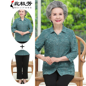 北极芳 妈妈装中袖衬衫60-80岁中老年女装老太太奶奶装夏装上衣两件套装翻领衬衣104-QH2021 绿色套装 2XL【105-120斤】