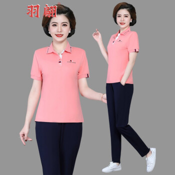 羽翩中年女装夏装40岁50岁中老年人短袖t恤上衣长裤气质妈妈装夏天妇女洋气薄运动服两件套装 粉色 XL