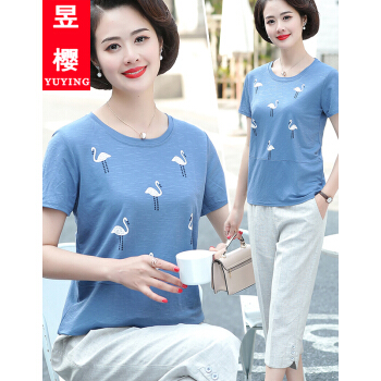 昱樱中老年女装短袖t恤套装2020夏装新款4050岁中年女装上衣裤子妇女休闲宽松大码衣服妈妈两件套 蓝色+棉麻裤 此码勿拍.请拍自身对应码数